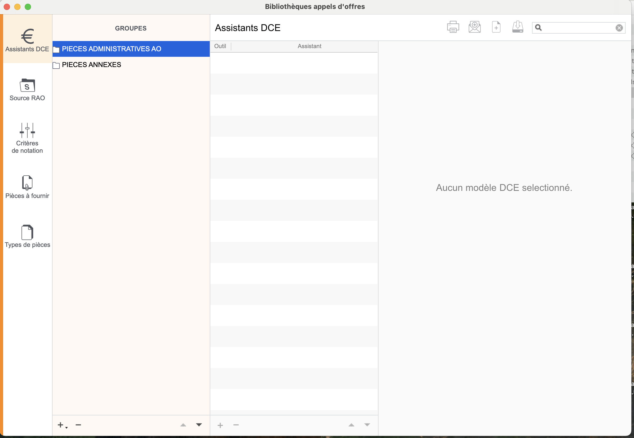 Bonjour, sur l’assistant, DCE, j’arrive à créer des groupes dans ma bibliothèque d’appel d’offres mais je n’arrive pas à mettre de modèle DCE. C’est grisé et je peux rien faire.! Pouvez-vous m’aider s’il vous plaît?