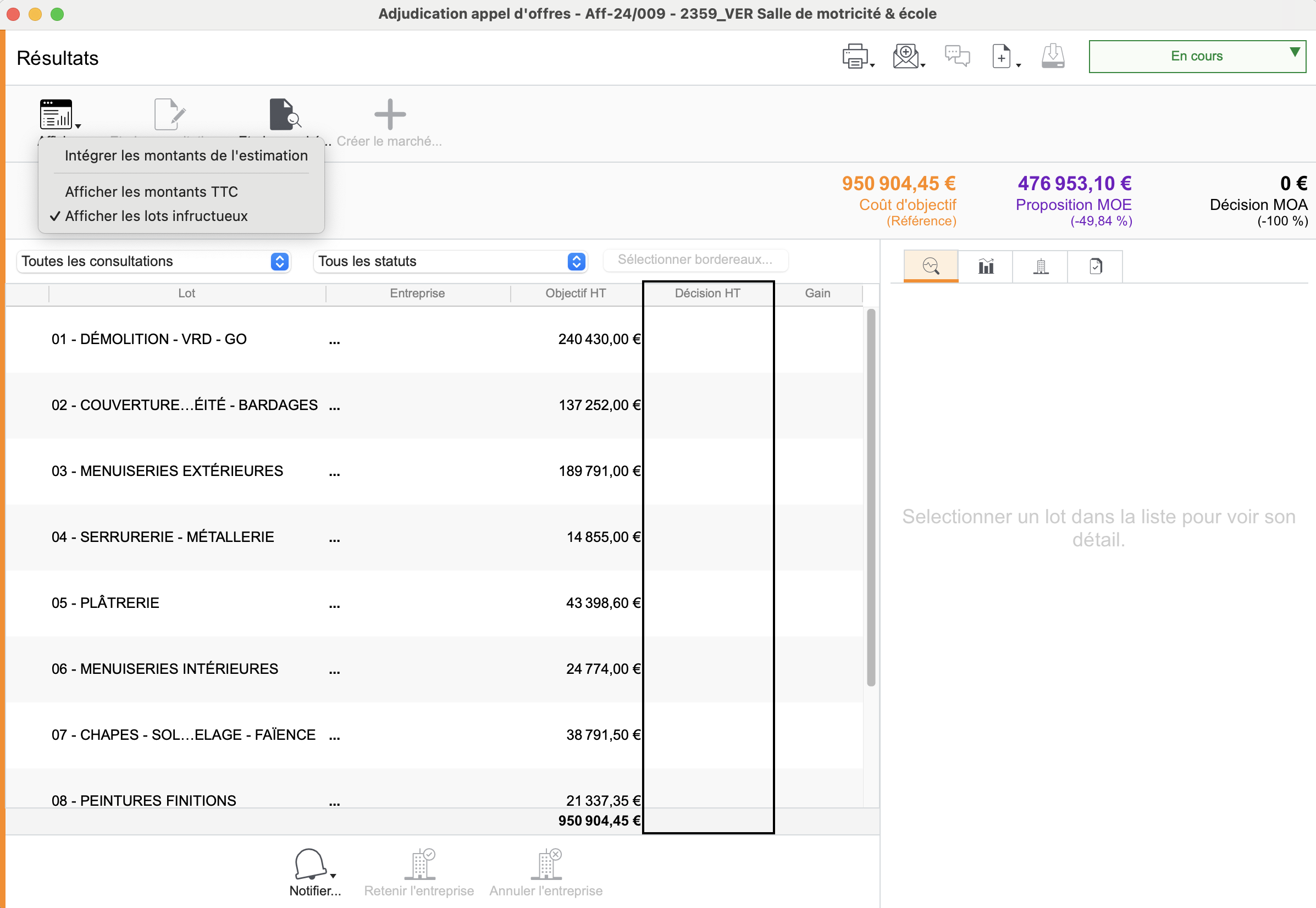 Pouvez vous confirmer que lorsque vous passez votre appel d’offres en TERMINÉ, des messages vous alertent que tous les lots non-attribués vont passer en infructueux ? Peut-être faudrait-il renforcer cette alerte ?