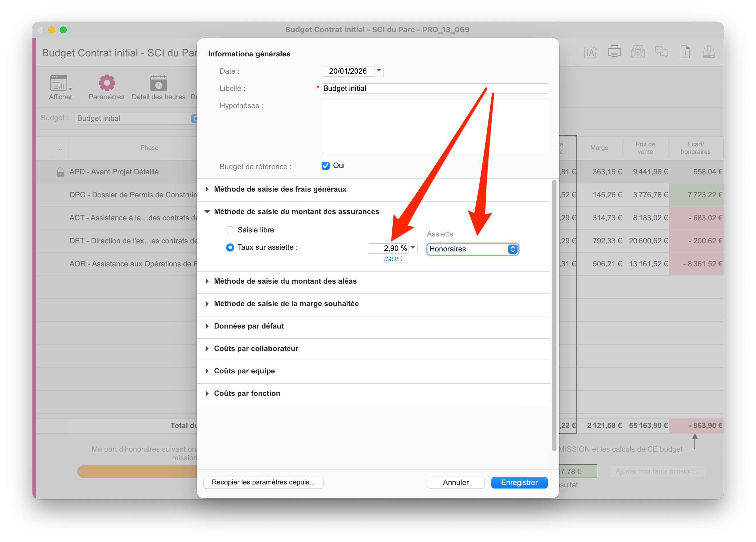 On ne peut pas accéder au montant des travaux depuis le paramétrage du montant des assurances dans le calcul des budgets. On dispose par contre du montant des honoraires. En assumant que le montant des honoraires soit un pourcentage du montant des travaux, on peut calculer un taux dans le paramètre d’assurance qui puisse s’appliquer aux honoraires.