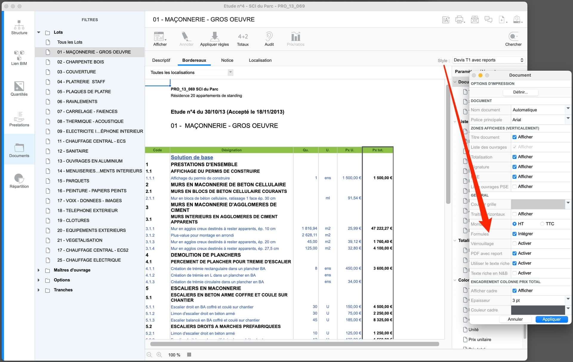 Vous pouvez tout faire normalement en évaluation ce n’est pas la question. Le style est un ensemble de réglages qui déterminent l’aspect de votre document final. Dans les options du style, vous cochez les données que vous souhaitez afficher, leur aspect et mise en page. notamment l’insertion de formules en vue d’export Excel est une option du style. Vous pouvez mémoriser tous les styles nécessaires pour faire des DPGF, Devis, estimatif, récapitulatifs, etc…