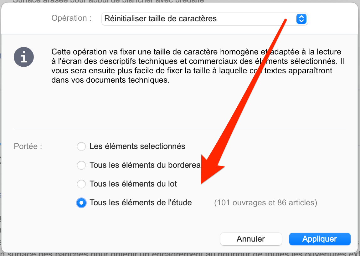 Vous disposez d’un clic droit APPLIQUER UNE OPÉRATION / SUR LES DESCRIPTIFS où vous choisissez l’opération à effectuer (RÉINITIALISER TAILLE CARACTÈRES dans votre cas) puis la portée de l’opération (choisissez TOUS LES ÉLÉMENTS DE L’ÉTUDE) puis cliquez sur APPLIQUER. Cela ré-initialisera tous les descriptifs de votre étude.
